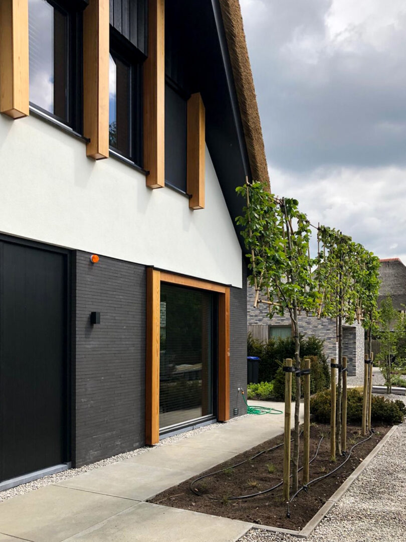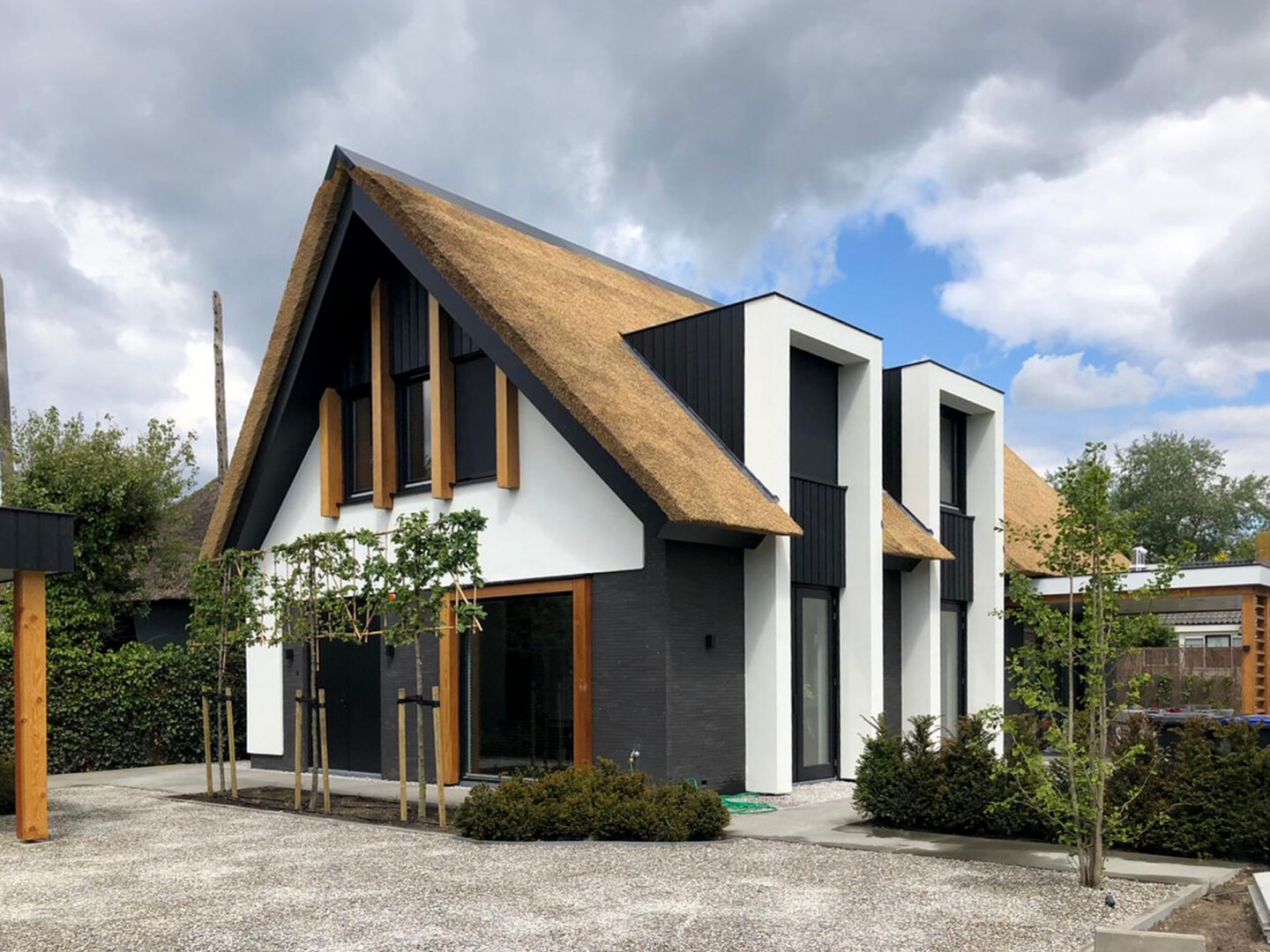 De wens van de opdrachtgever was een moderne woning met rieten zadeldak voorzien van witte stucwerk elementen.